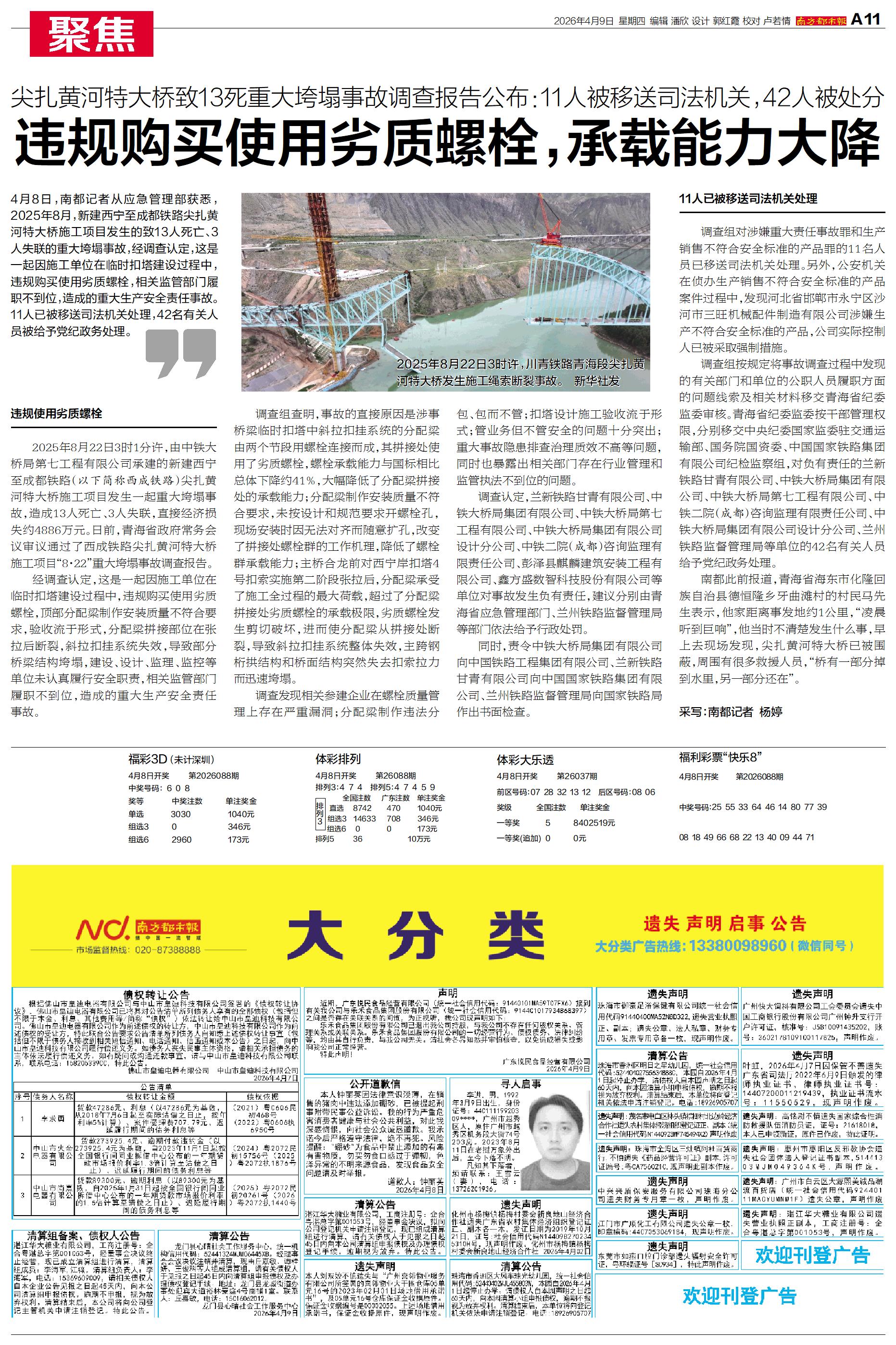 4月8日,南都记者从应急管理部获悉,2025年8月,新建西宁至成都铁路尖扎黄河特大桥施工项目发生的致13人死亡、3人失联的重大垮塌事故,经调查认定,这是一起因施工单位在临时扣塔建设过程中,违规购买使用