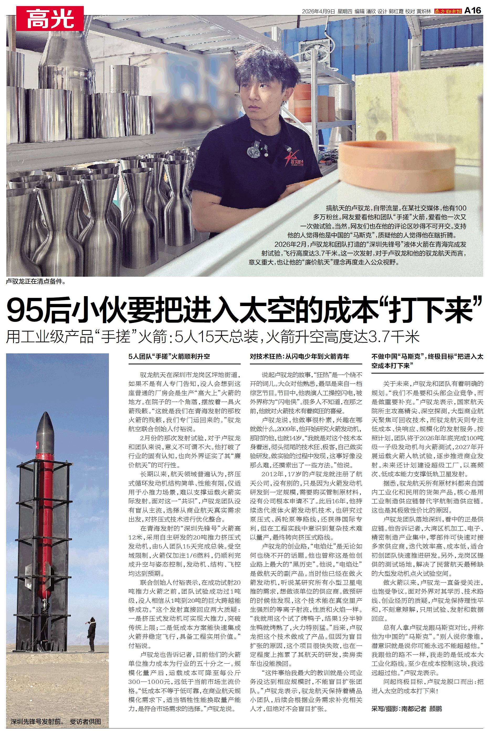 2026年2月,卢驭龙和团队打造的“深圳先锋号”液体火箭在青海完成发射试验,飞行高度达3.7千米。