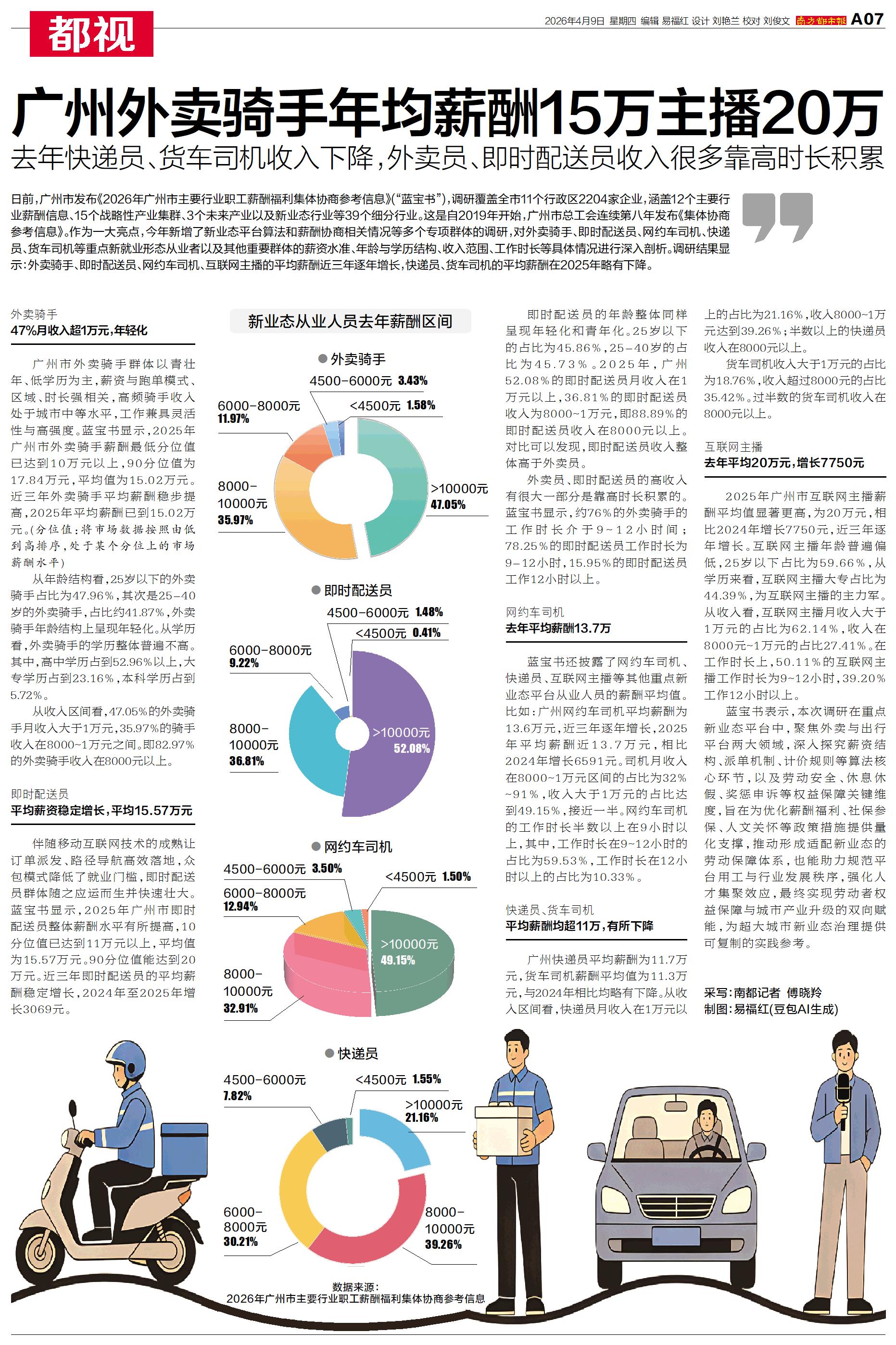 广州外卖骑手年均薪酬15万主播20万