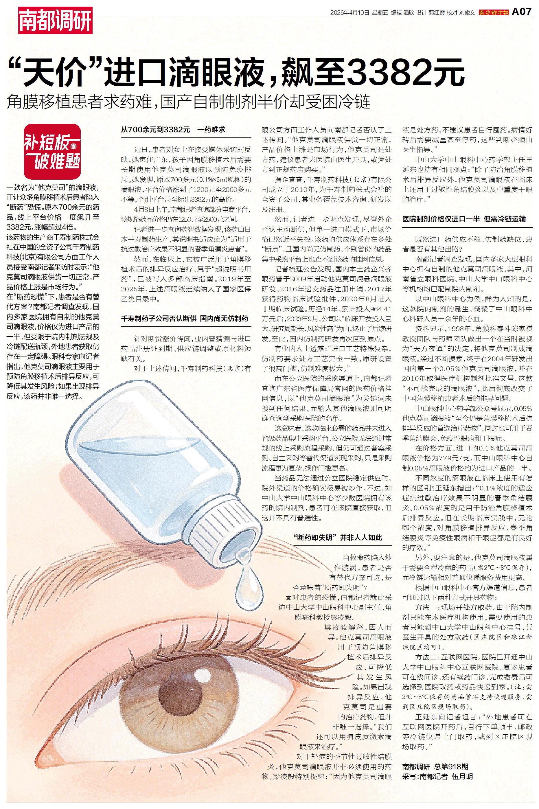 在“断药恐慌”下,患者是否有替代方案?南都记者调查发现,国内多家医院拥有自制的他克莫司滴眼液,价格仅为进口产品的一半,但受限于院内制剂法规及冷链配送瓶颈,外地患者获取仍存在一定障碍。眼科专家向记者指出,他克莫司滴眼液主要用于预防角膜移植术后排异反应,可降低其发生风险;如果出现排异反应,该药并非唯一选择。