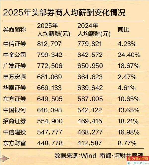 南都湾财社结合Wind及公司公告数据,对中信证券、中金公司、广发证券、华泰证券、申万宏源、中信建投、招商证券、东方证券、中国银河等多家头部机构进行梳理后发现,在市场交投回暖、业务结构持续优化的背景下,头部券商人均薪酬呈现全面同比增长态势,多数机构实现两位数增幅,行业整体薪酬水平重回上行通道。