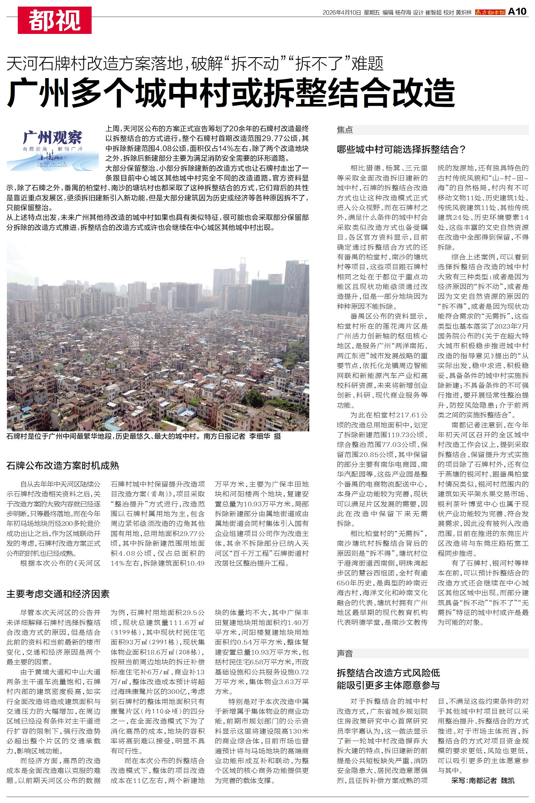 上周,天河区公布的方案正式宣告筹划了20余年的石牌村改造最终以拆整结合的方式进行。