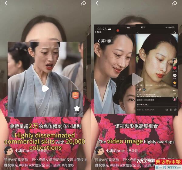 AI形象侵权事件早已不是个例。此前南都曾报道过,水哥王昱珩被AI侵权其形象用于带货,也有媒体报道过AI短剧《鲛珠引》疑似盗用摄影师原创作品的模特形象与妆造。