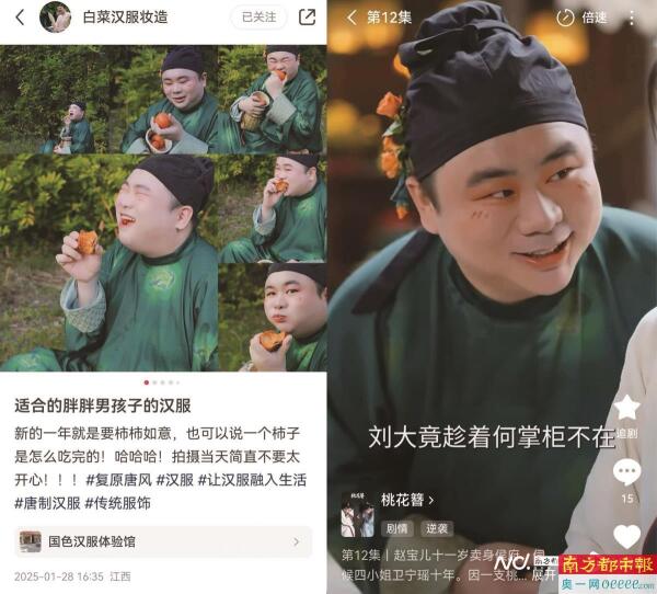 3月30日,白菜收到了好友发来的截图,说一部AI短剧中有一个角色跟他长得几乎一模一样。白菜发现,这部AI短剧《桃花簪》里有一个叫“刘大”的角色,无论是五官、造型还是妆容,都与自己去年1月发布的一组唐风汉服写真高度相似。
