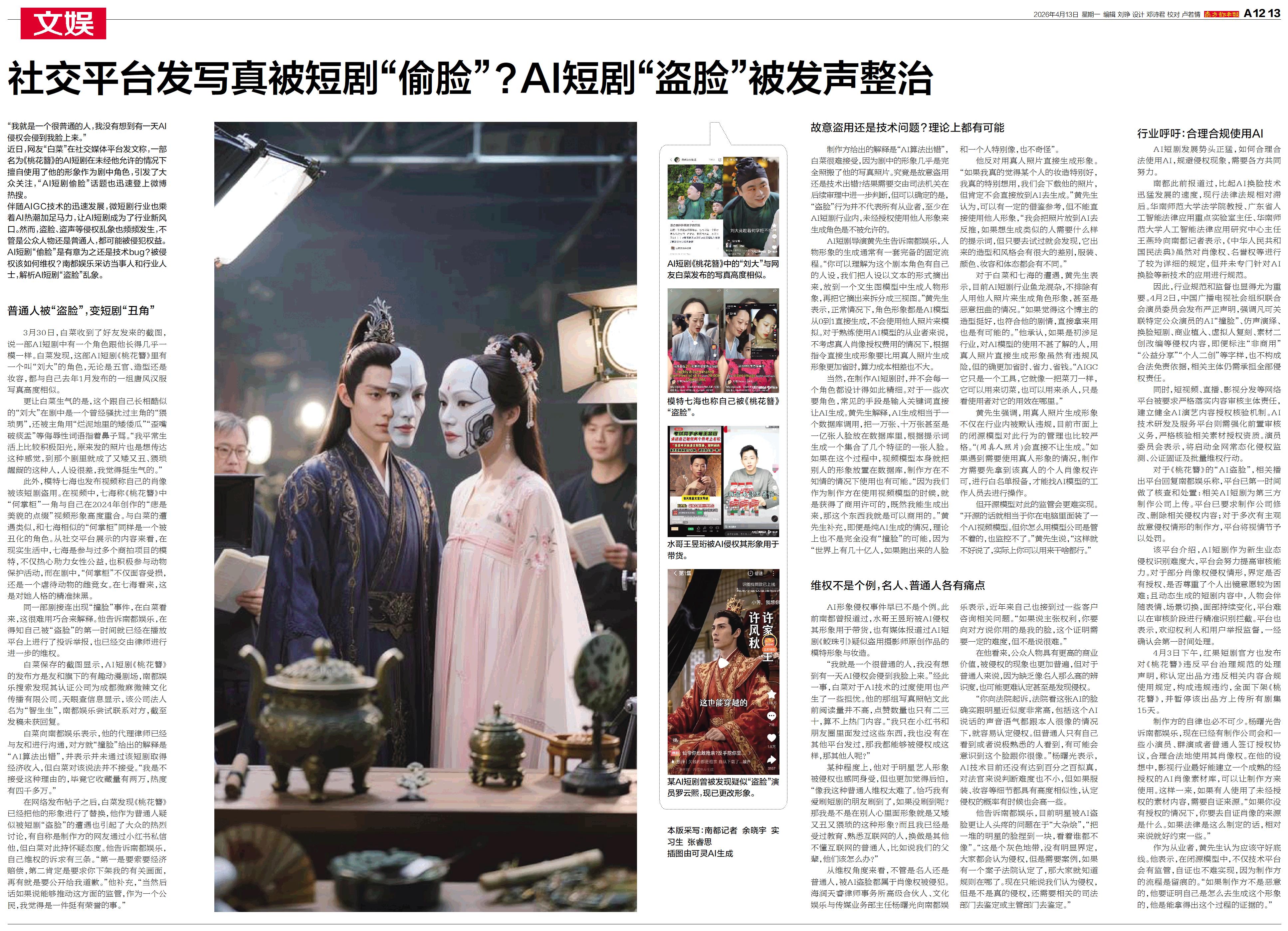 社交平台发写真被短剧“偷脸”?AI短剧“盗脸”被发声整治