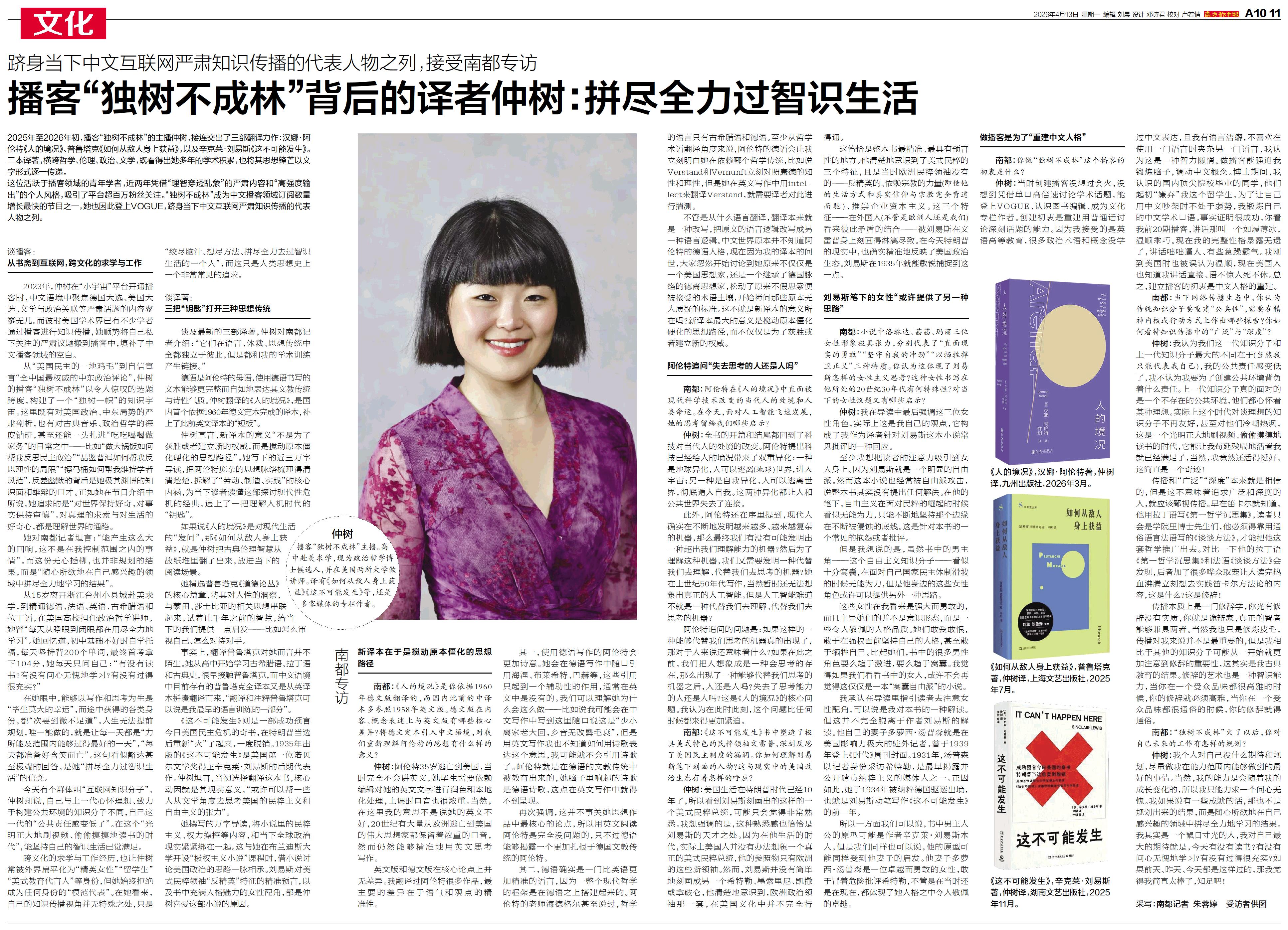 2025年至2026年初,播客“独树不成林”的主播仲树,接连交出了三部翻译力作:汉娜·阿伦特《人的境况》、普鲁塔克《如何从敌人身上获益》,以及辛克莱·刘易斯《这不可能发生》。
