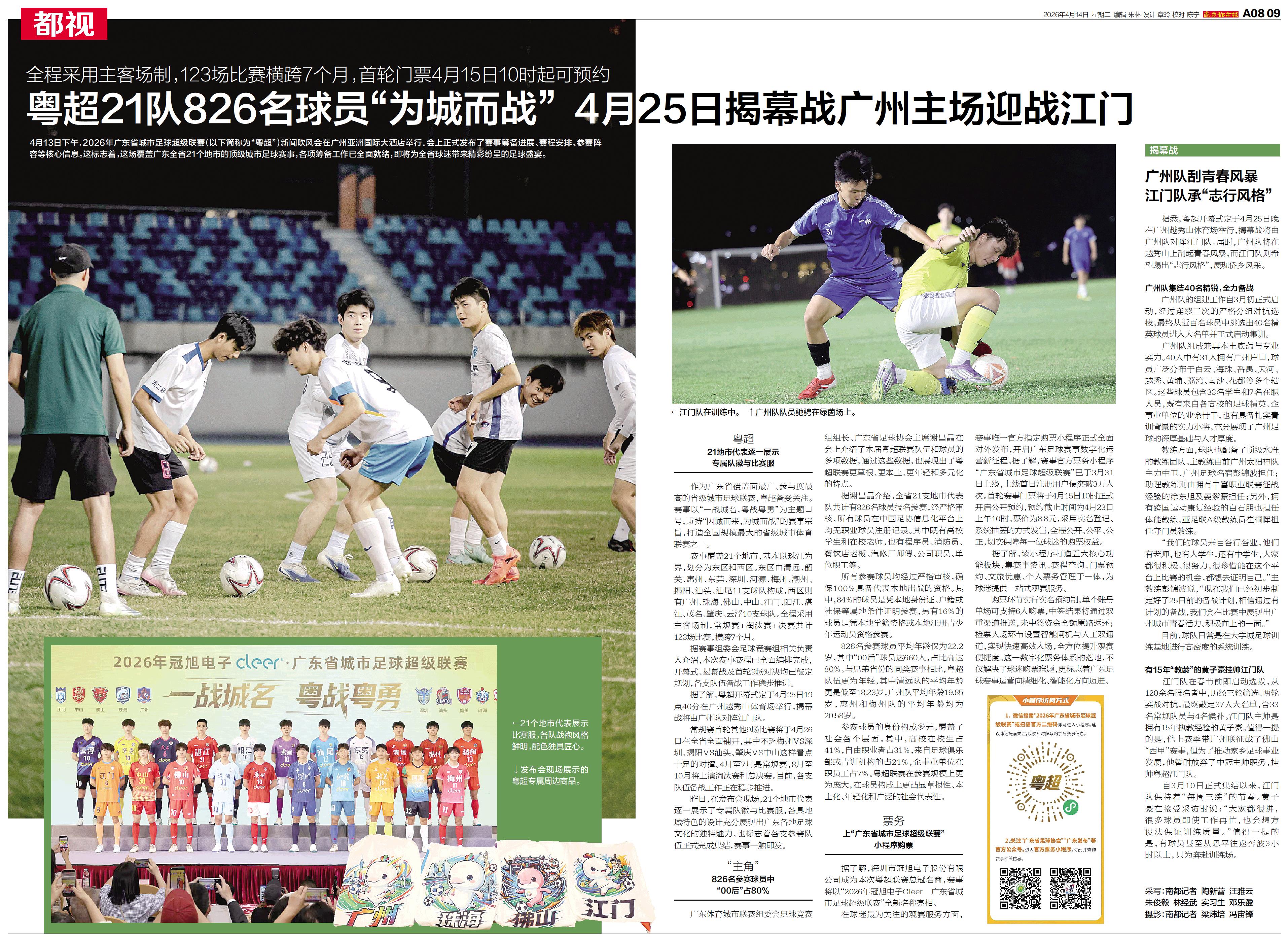 粤超21队826名球员“为城而战”4月25日揭幕战广州主场迎战江门