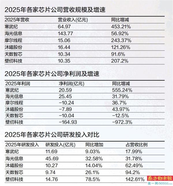 近期,国产AI芯片公司陆续交出2025年的“成绩单”,南都记者梳理了海光信息、寒武纪、摩尔线程、沐曦股份、天数智芯、壁仞科技六家上市公司的业绩情况后发现,受益于推理侧算力需求的爆发式增长,各家均在去年实现了收入增长,但利润侧还有较大突破空间。其中,寒武纪首度扭亏,但连续两季度环比下滑;海光信息增速放缓,去年底新上市“四小龙”均未扭亏。