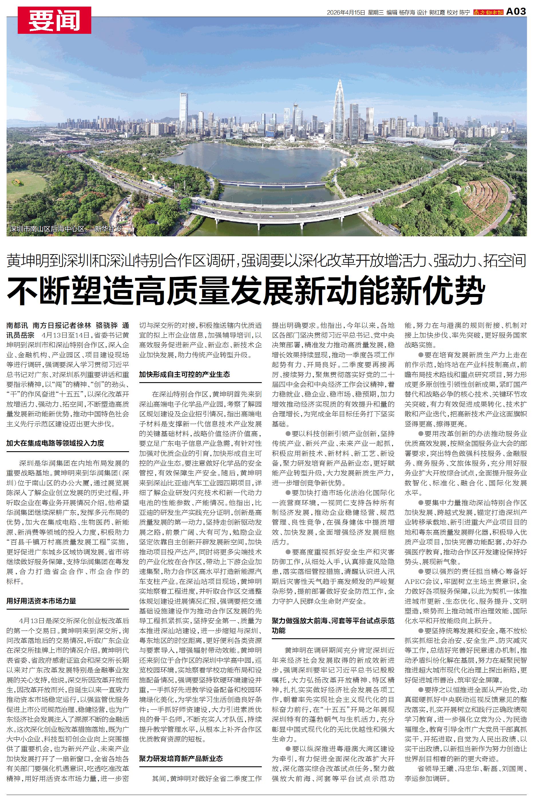 4月13日至14日,省委书记黄坤明到深圳市和深汕特别合作区,深入企业、金融机构、产业园区、项目建设现场等进行调研。