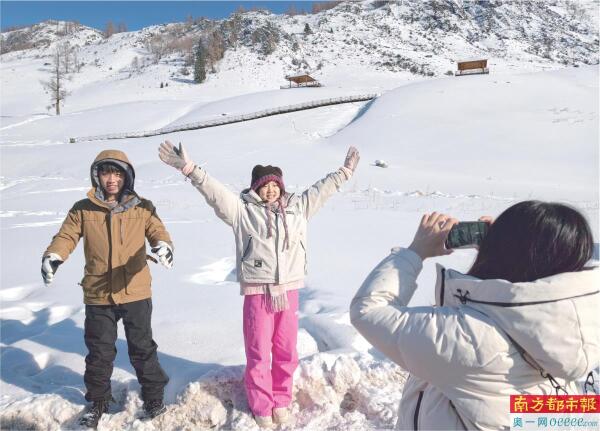 台湾青年在新疆喀纳斯景区的雪地里拍照。 新华社发