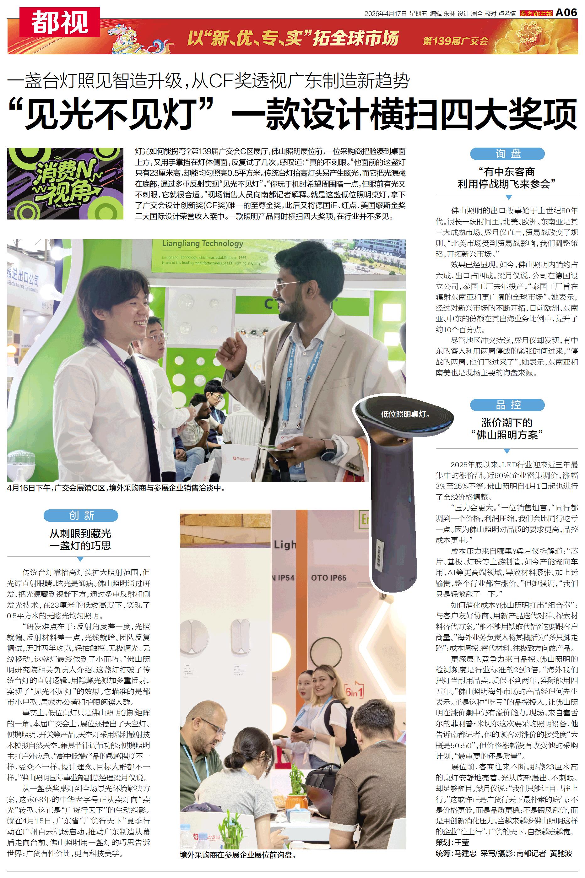 灯光如何能拐弯?第139届广交会C区展厅,佛山照明展位前,一位采购商把脸凑到桌面上方,又用手掌挡在灯体侧面,反复试了几次,感叹道:“真的不刺眼。”
