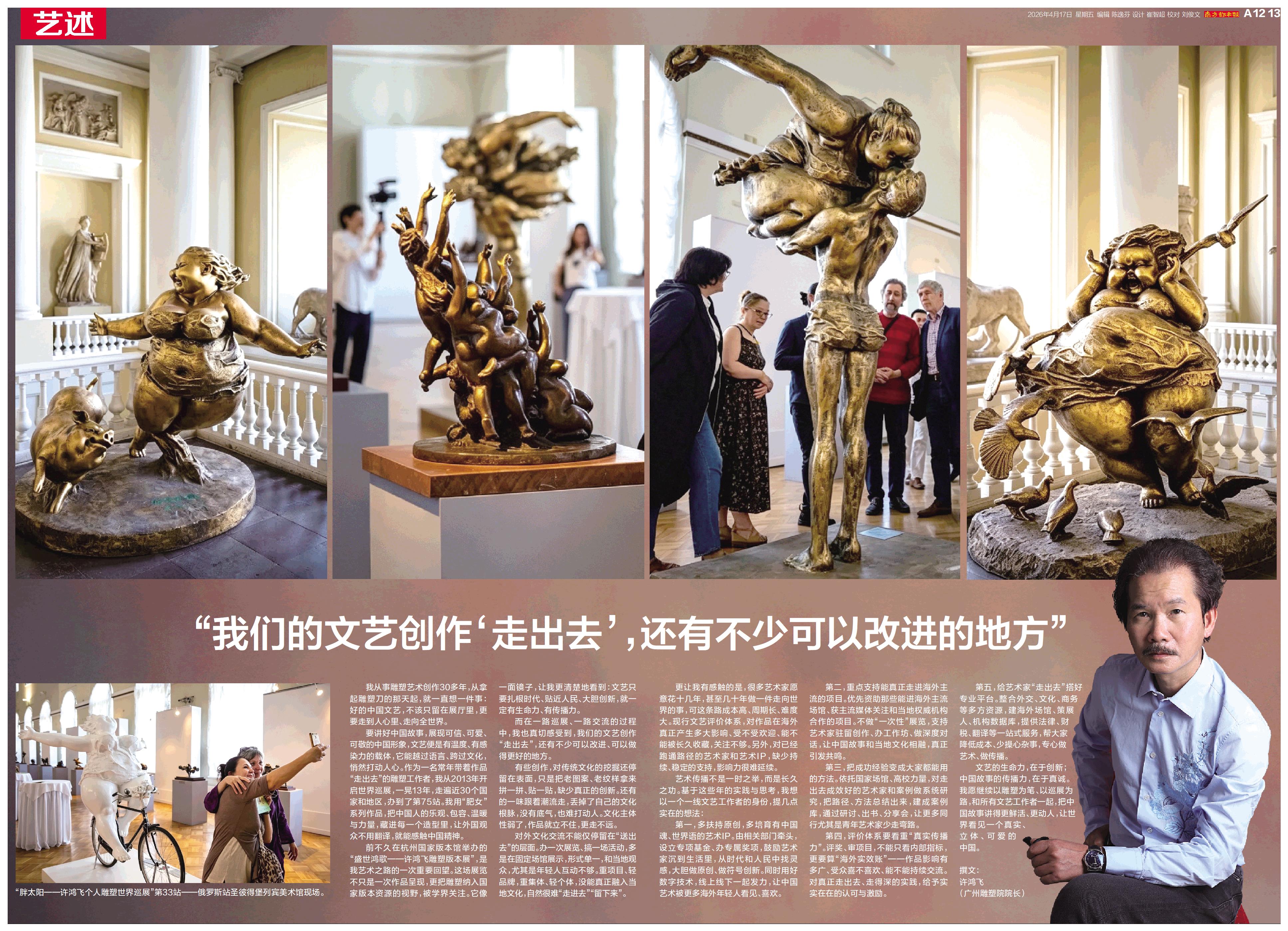 我从事雕塑艺术创作30多年,从拿起雕塑刀的那天起,就一直想一件事:好的中国文艺,不该只留在展厅里,更要走到人心里、走向全世界。