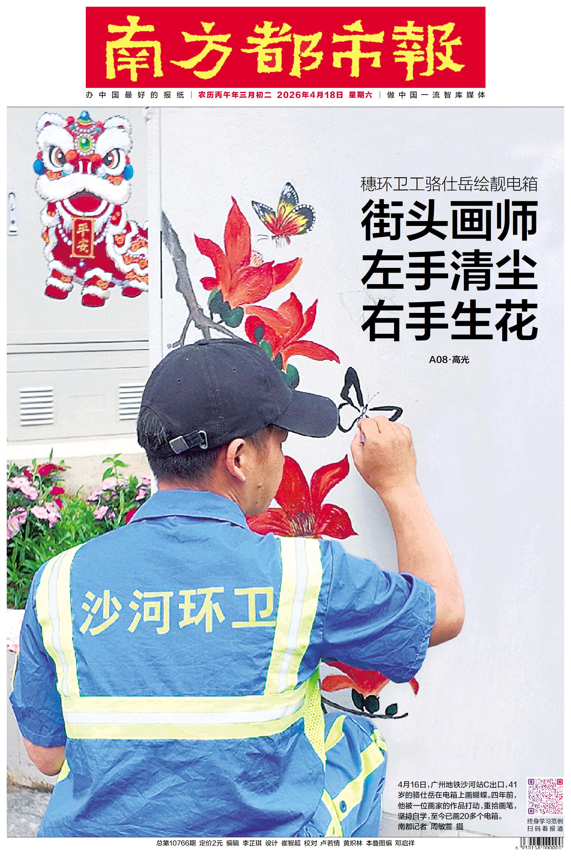 4月16日,广州地铁沙河站C出口,41岁的骆仕岳在电箱上画蝴蝶。四年前,他被一位画家的作品打动,重拾画笔,坚持自学,至今已画20多个电箱。南都记者 周敏萱 摄