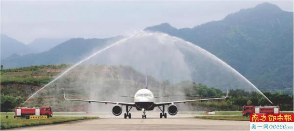 韶关丹霞机场以“过水门”仪式迎接一架载有180余名云南游客的航班平稳降落。