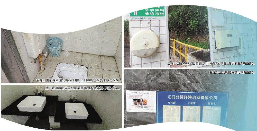 设施老化、破损问题也较为突出。圭峰山国家森林公园公厕(永镇山门)男厕2个感应水龙头不出水,无法正常使用;蓬江国际马拉松公园公厕男厕盥洗台外板破损、缺失,厕所外墙面破损、多处开裂;蓬江碧道运动公园公厕男厕门破损,墙面多处破损、脱落、发霉;江门儿童公园沙主题游乐区公厕镜子陈旧、表面有破损,男厕所内部墙面出现严重脱落,部分配套设施损坏未及时维修;篁庄公园公厕男厕有厕位“暂停使用”,厕位门存在破损和污渍;园山湖公园公厕(西北角停车场旁)男厕厕位门破损;龙舟山公园(蓬江治水展示中心旁)公厕男厕无障碍卫生间门锁着,无法使用。