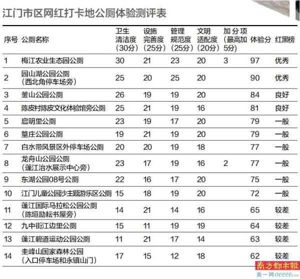 此次测评体验分满分为100分,经测评,江门市区14座公厕,2座得分超过90分,体验感受“优秀”,登上红榜,分别是梅江农业生态园公厕、园山湖公园公厕(西北角停车场旁);4座得分在65分以下,体验感受“较差”,进入黑榜,分别是圭峰山国家森林公园公厕(入口停车场和永镇山门)、蓬江碧道运动公园公厕、蓬江国际马拉松公园公厕(陈垣励耘书屋旁)和江边里九中街公厕;其余8座得分在72分至84分之间,体验感受为“良好或一般”。