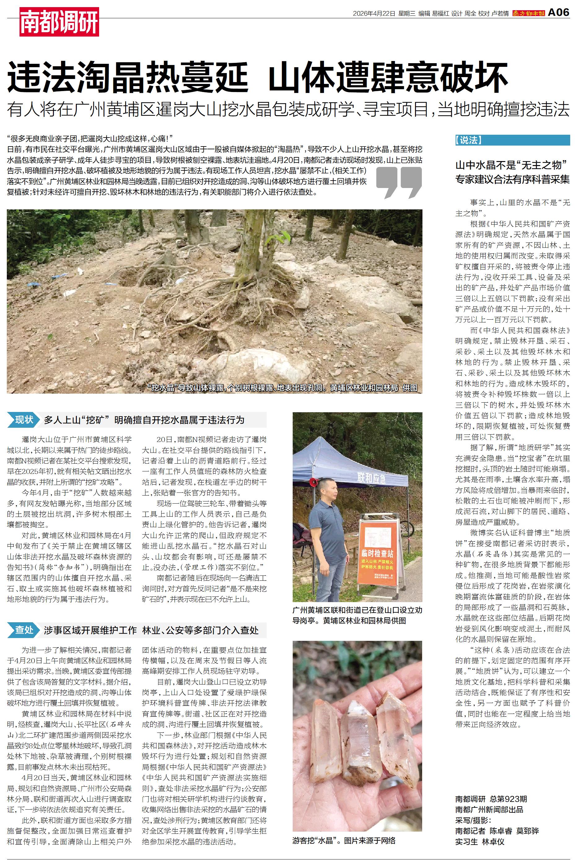 日前,有市民在社交平台曝光,广州市黄埔区暹岗大山区域由于一股被自媒体掀起的“淘晶热”,导致不少人上山开挖水晶,甚至将挖水晶包装成亲子研学、成年人徒步寻宝的项目,导致树根被刨空裸露、地表坑洼遍地。