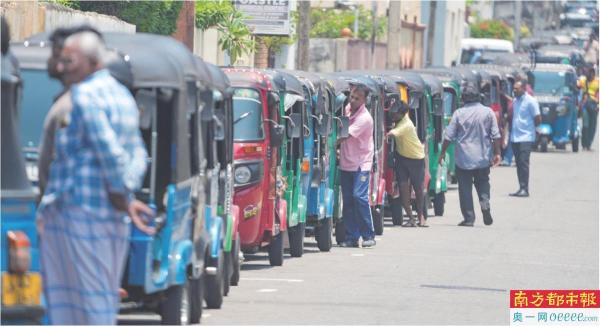 在斯里兰卡首都科伦坡,人们在加油站附近排队等待为车辆加油。 新华社发