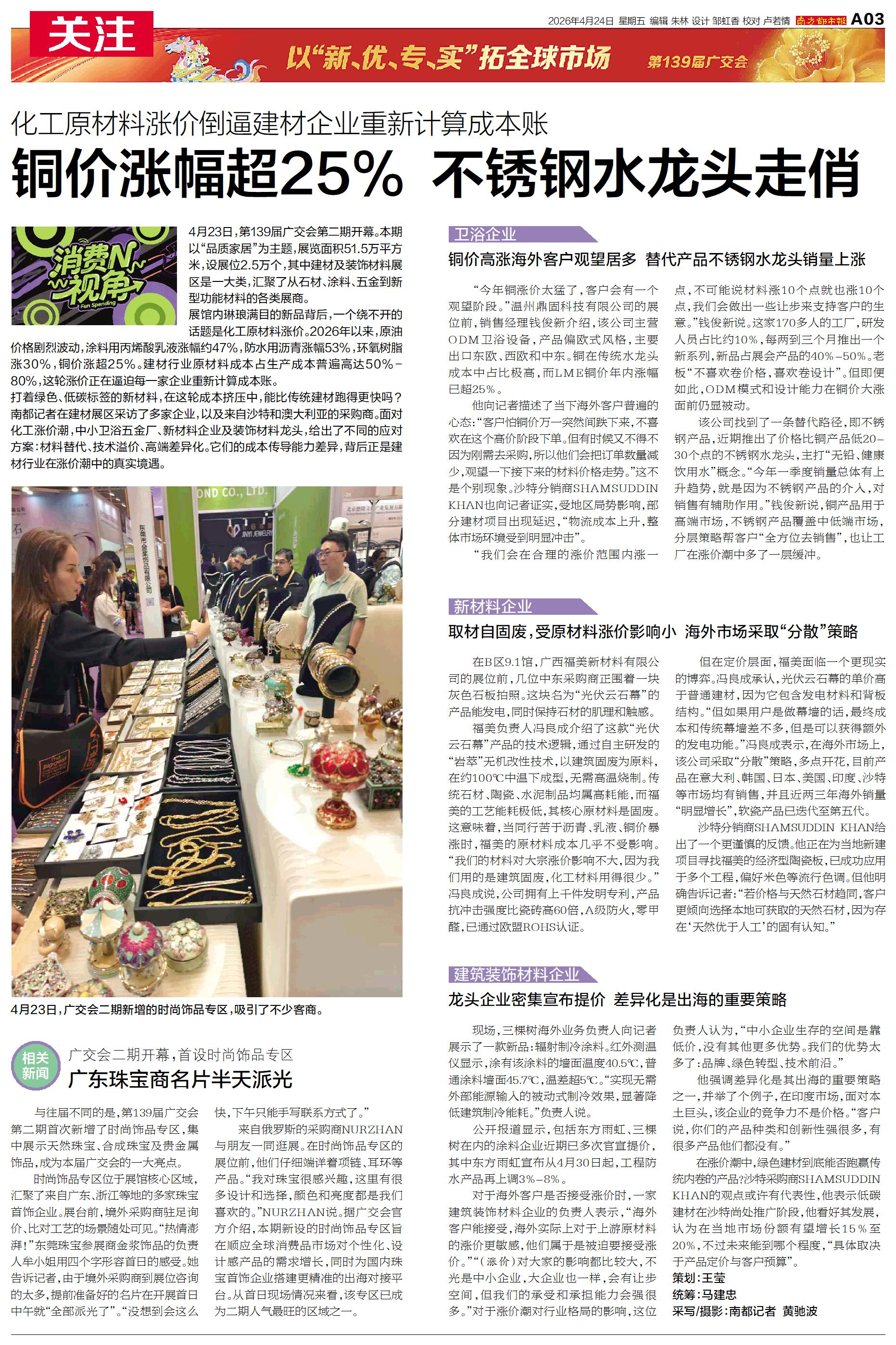 打着绿色、低碳标签的新材料,在这轮成本挤压中,能比传统建材跑得更快吗?南都记者在建材展区采访了多家企业,以及来自沙特和澳大利亚的采购商。面对化工涨价潮,中小卫浴五金厂、新材料企业及装饰材料龙头,给出了不同的应对方案:材料替代、技术溢价、高端差异化。它们的成本传导能力差异,背后正是建材行业在涨价潮中的真实境遇。