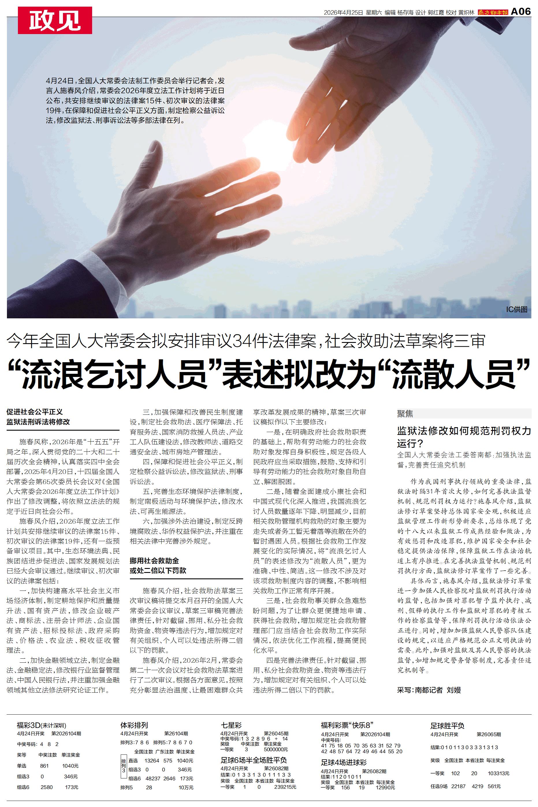 4月24日,全国人大常委会法制工作委员会举行记者会,发言人施春风介绍,常委会2026年度立法工作计划将于近日公布,共安排继续审议的法律案15件、初次审议的法律案19件。
