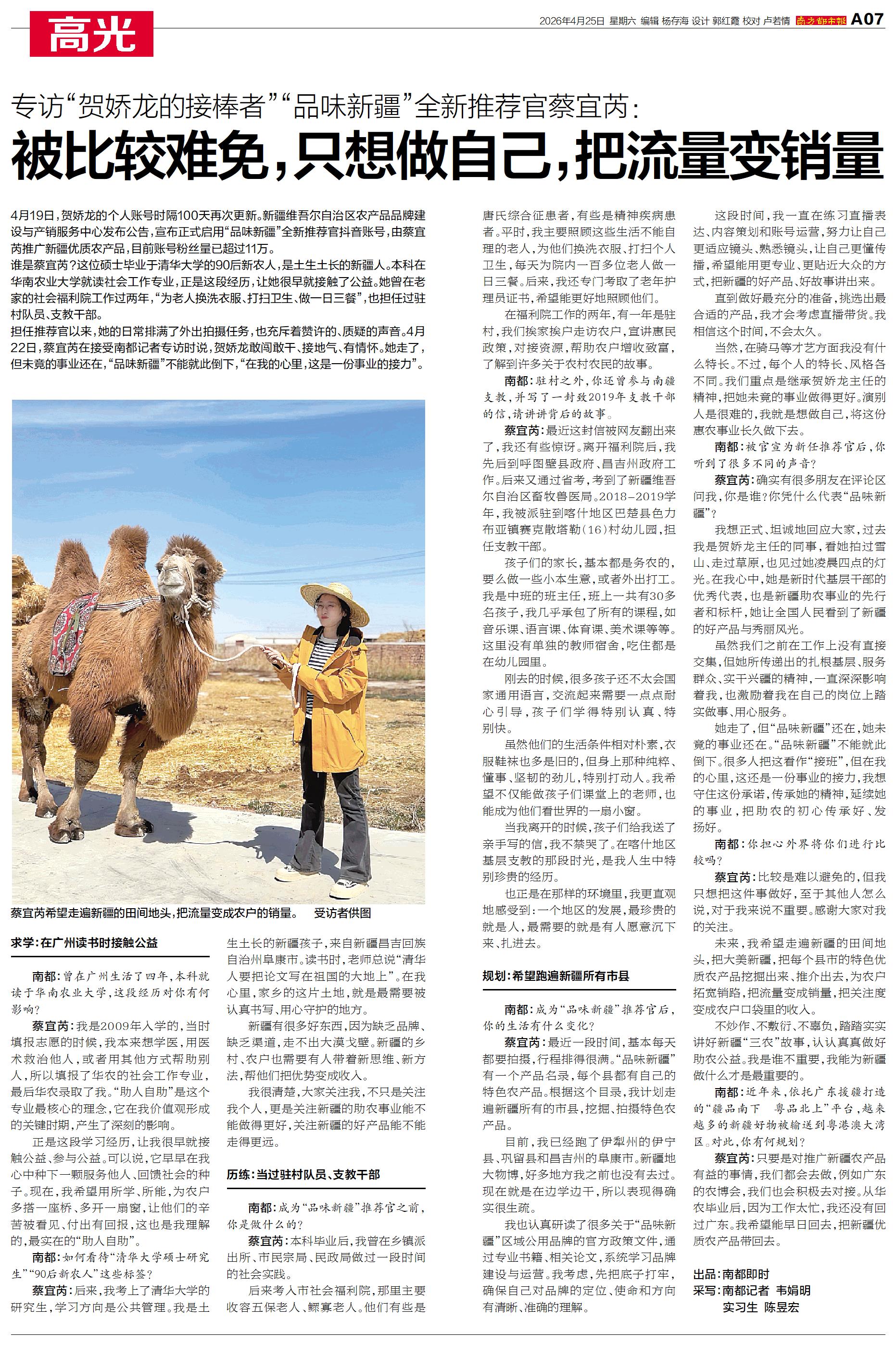4月19日,贺娇龙的个人账号时隔100天再次更新。新疆维吾尔自治区农产品品牌建设与产销服务中心发布公告,宣布正式启用“品味新疆”全新推荐官抖音账号,由蔡宜芮推广新疆优质农产品,目前账号粉丝量已超过11