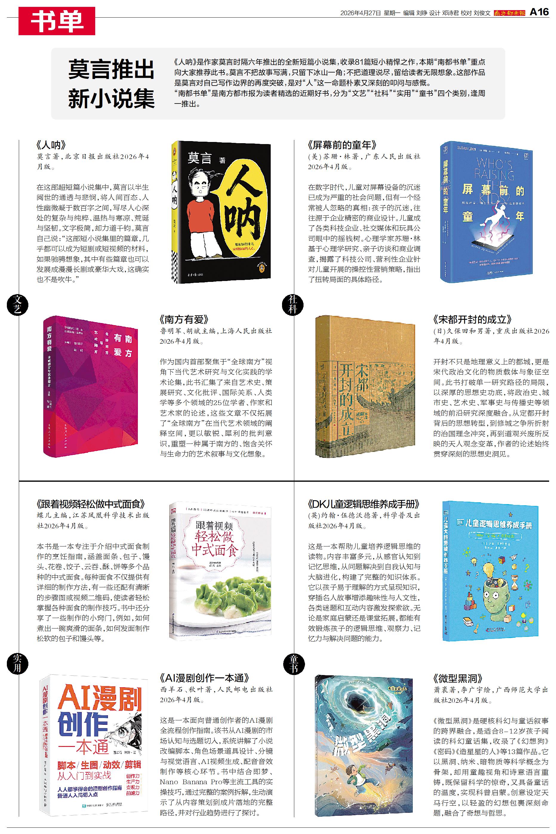 《人呐》是作家莫言时隔六年推出的全新短篇小说集,收录81篇短小精悍之作,本期“南都书单”重点向大家推荐此书。
