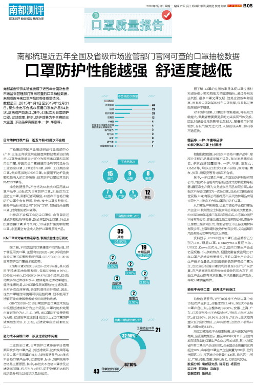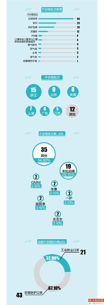 数据显示,2015年1月1日至2019年12月31日,至少检出不合格非医用口罩类产品64批次,超两成产自浙江。其中,43批次为日常防护口罩。过滤效率、标识、防护效果为不合格的三大主因,涉及品牌有霾丽净、一护、华康等。