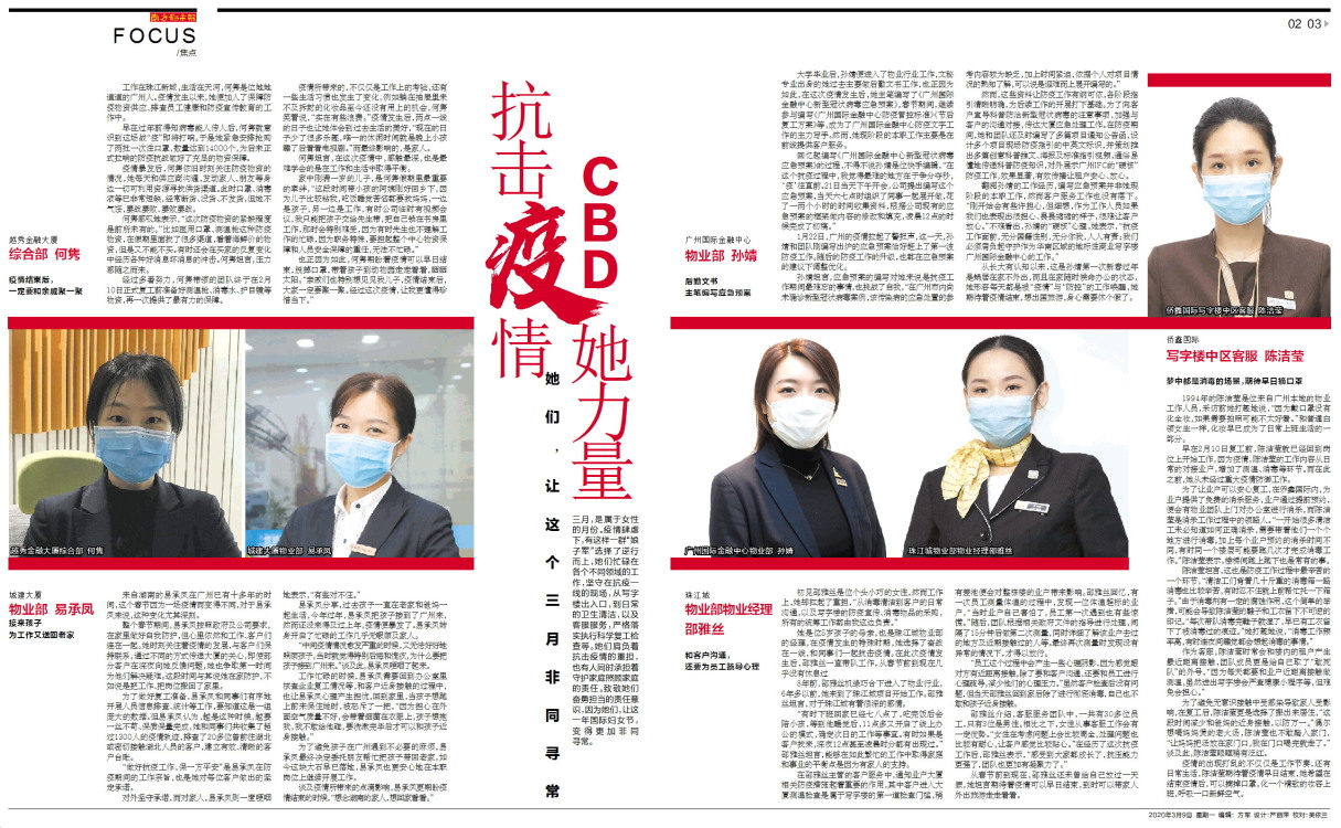 三月,是属于女性的月份。疫情肆虐下,有这样一群“娘子军”选择了逆行而上,她们忙碌在各个不同领域的工作,坚守在抗疫一线的现场,从写字楼出入口,到日常的卫生清洁,以及客服服务,严格落实执行科学复工检查等。