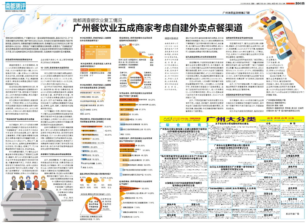 受新冠肺炎疫情影响,广州餐饮企业一度全面暂停堂食服务。直至2月21日,《广州市推动餐饮业有序复工复产指引(试行)》出台,市内部分区域的堂食服务才逐步有限恢复。这段时间,消费者的餐饮消费情况如何,各类餐