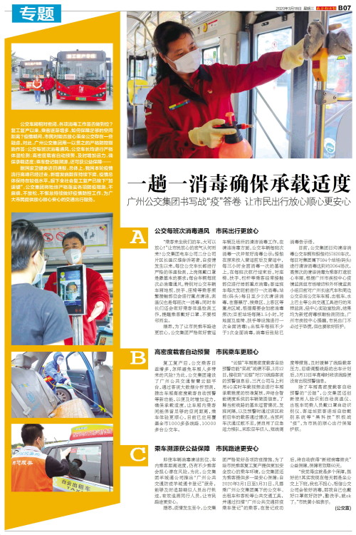 公交车厢相对密闭,各项消毒工作是否做到位?复工复产以来,乘客逐渐增多,如何保障足够的空间距离?疫情期间,市民对能否放心乘坐公交存在一些疑虑。对此,广州公交集团用一以贯之的严格防控措施作答:公交每班次消毒通风、公交车长均进行严格体温检测;高密度载客自动预警,及时增加运力,确保承载适度;乘车登记能溯源,还可获公益保障……