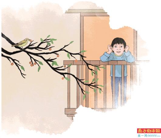 某天,我做着作业,听见外面几声鸟鸣,禁不住抬头望向窗外。广州的春天来临并没有什么特别的。由于这亚热带季风气候,窗外仍是“海棠依旧”。一只有点胖的、灰黄色的小鸟在树枝间蹦跳着,时不时低下头来啄一下果子。我小心地放下手中的书本奔向阳台,正当我准备过去时,它早已警觉地飞走了。我的心里不禁有些许失落。