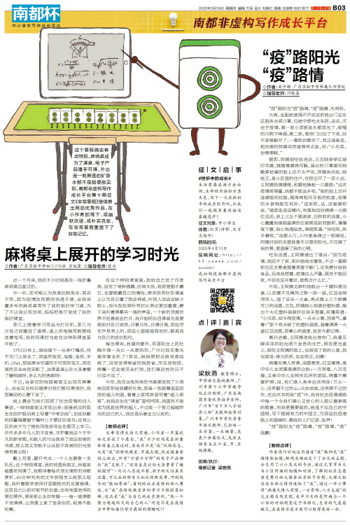 这个寒假确实有点特别。麻将桌成为了课桌,电子产品唾手可得,外出连一瓶普通的矿泉水都不是随便能买到。南都非虚构写作成长平台第十期征文《非常寒假》继续推出两篇优秀作品,在小作者的笔下,或幽默诙谐,或朴实真