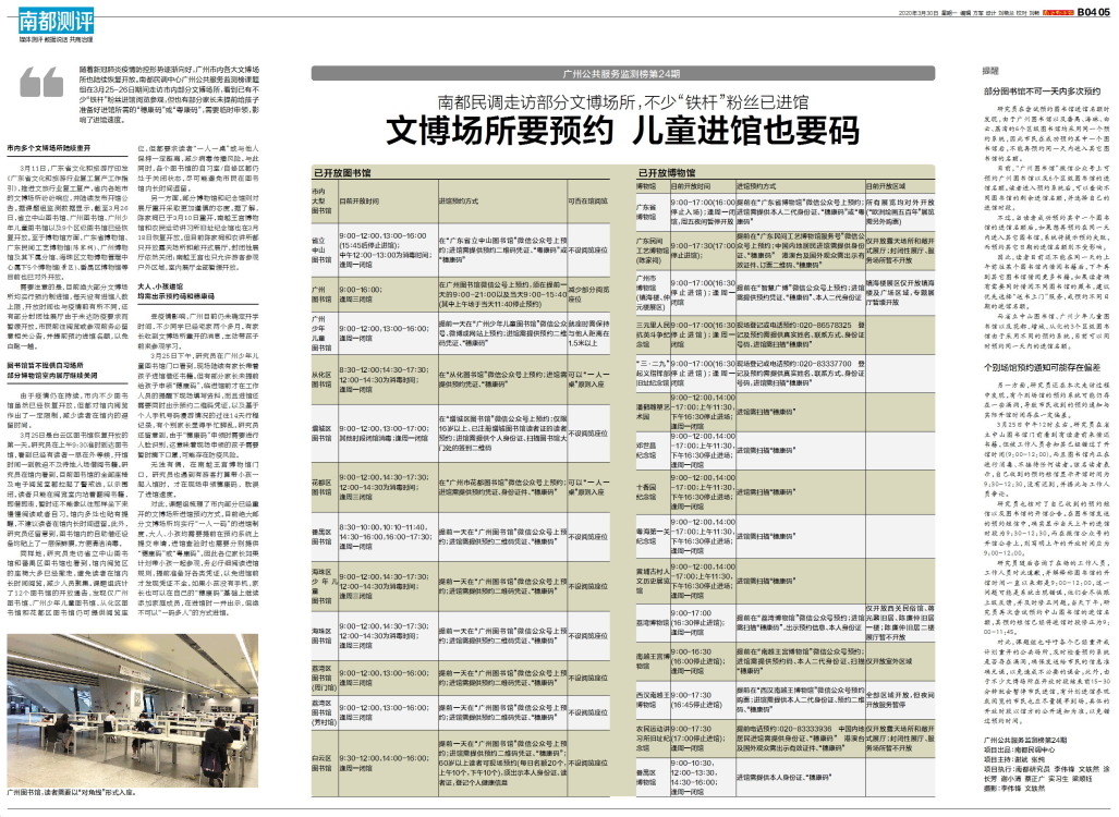 广州公共服务监测榜第24期随着新冠肺炎疫情防控形势逐渐向好,广州市内各大文博场所也陆续恢复开放。南都民调中心广州公共服务监测榜课题组在3月25-26日期间走访市内部分文博场所,看到已有不少“铁杆”