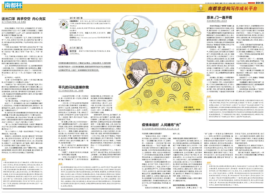 青春期,亲子沟通总感觉“爱”错了位,孩子懂得父母的爱,父母珍惜着孩子的陪伴,但见了面,话到了嘴边,却总变了味儿地词不达意。本来想说一句“宝贝儿,还没睡?”出口变成责备;本来是一句“你终于回来了,太想你了”出口变成了“你也知道已经很晚了?”这就是爱的错位,而作者将这种错位的亲情通过热饭、等待、转身表达得真切感人,并借助“门”来象征亲子沟通的障碍。作者通过回忆高中住校生活与母亲的关系,形成与后文惦记母亲状态的对比,巧妙地将青春期孩子的外在表现与内在情感真实地展现在读者面前。略显遗憾的是,“门”的隐喻在前文中较少提及,只在标题和结尾出现,如果前文中能够巧妙地带进“关门”的描写,后文“原来门一直是开的”就会更自然。