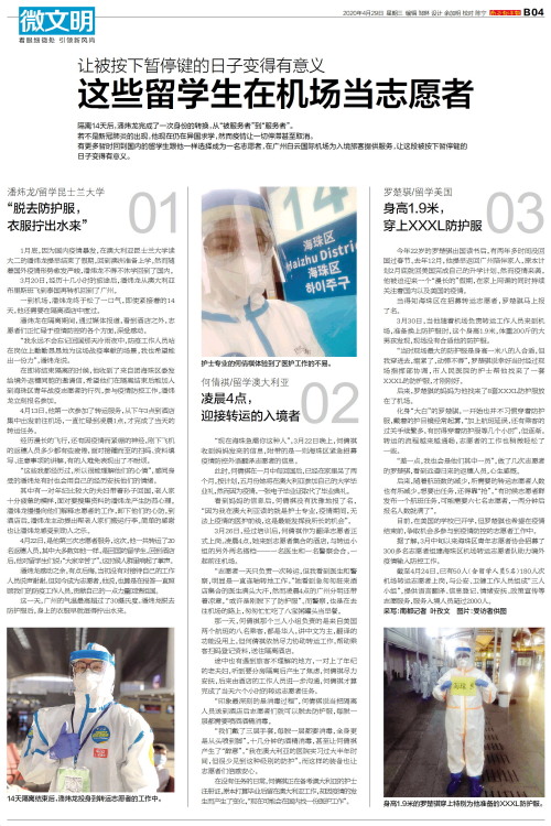 隔离14天后,潘炜龙完成了一次身份的转换,从“被服务者”到“服务者”。若不是新冠肺炎的出现,他现在仍在异国求学,然而疫情让一切停滞甚至取消。有更多暂时回到国内的留学生跟他一样选择成为一名志愿者,在广州