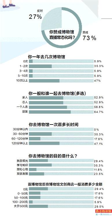 博物馆日来临之际,南都记者同时还进行了博物馆有多受欢迎的调查。据调查,有47%的人一年去10次以上博物馆,35.3%的人一年去1-2次博物馆,可见博物馆还是比较受欢迎的。