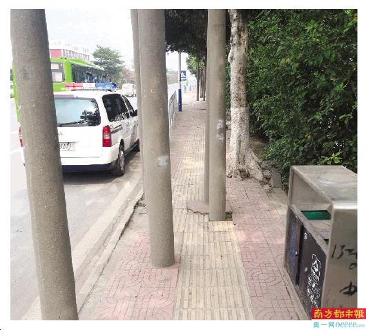 南沙区市南公路东涌段的盲道部分被其他设施切割。