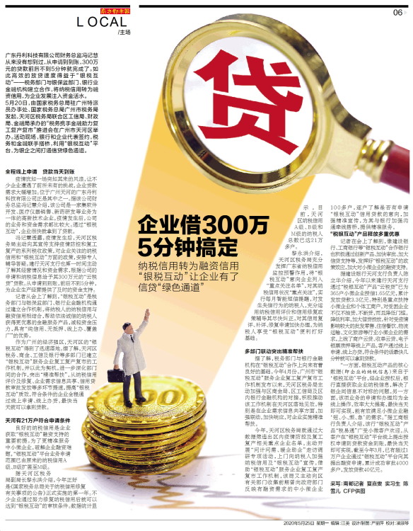 广东丹利科技有限公司财务总监冯记慧从来没有想到过,从申请到到账,300万元的贷款前后不到5分钟就完成了。如此高效的放贷速度得益于“银税互动”——税务部门与银保监部门、银行业金融机构建立合作,将纳税信用
