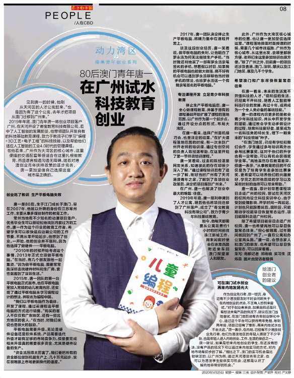 动力湾区之港澳青年创业系列见到唐一的时候,他刚从天河区的人才公寓赶来,“也是因为有了这个公寓,去年才把项目从澳门迁移到广州来。”2019年年底,澳门青年唐一将创业项目落户广州,在天河开设了奇宝教育