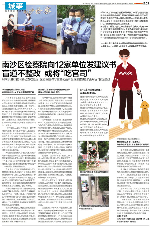 南沙区检察院向12家单位发建议书 盲道不整改 或将“吃官司”