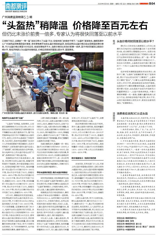 广州消费监测榜第53期口罩刚下风口,近期的“一带一盔”活动又带火了头盔!不过,在相关部门的有效干预下,“头盔热”逐渐散去。南都民调中心广州消费监测榜课题组对淘宝、京东等电商平台的头盔价格发起监测,