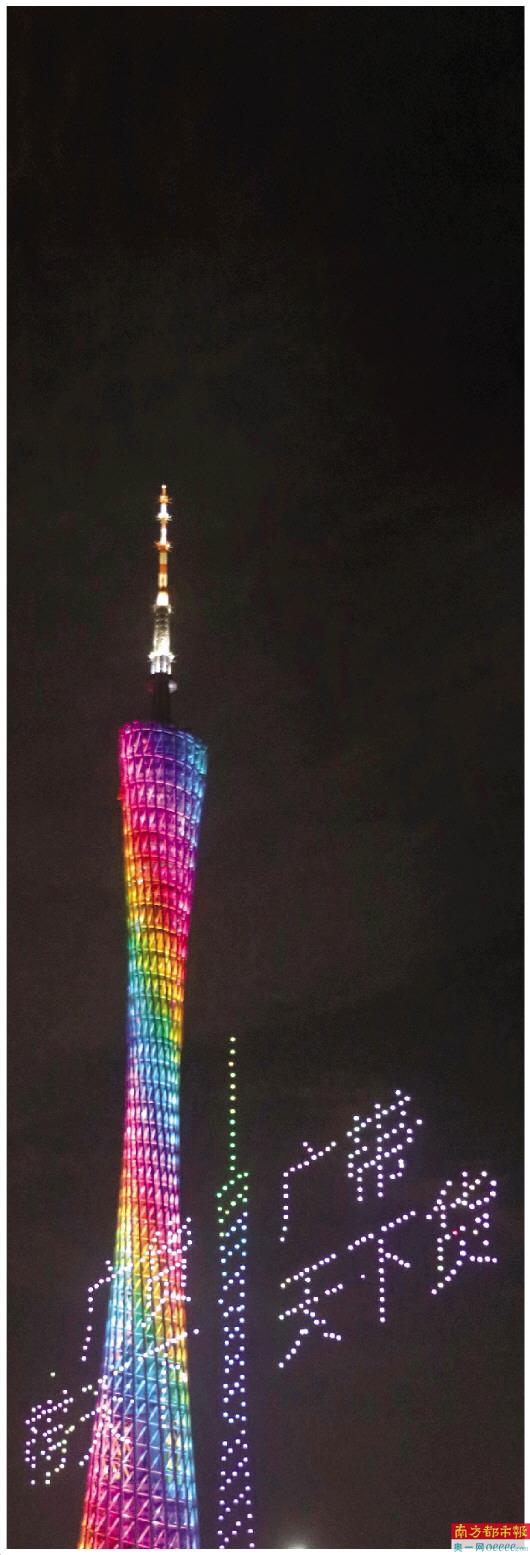 6月5日,首届直播节(中国·广州)开幕前夜,无人机在广州塔前摆出助力标语。