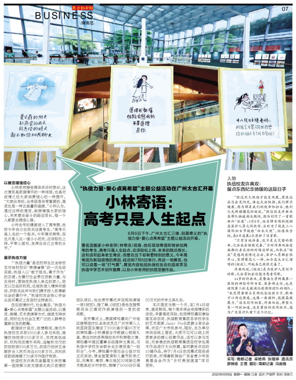 6月6日下午,广州太古汇三楼,别具意义的“执信力量·爱心点亮希望”主题公益活动开幕。著名漫画家小林老师(林帝浣)现身,他在现场寄语即将参加高考的考生,高考只是人生起点,应该轻松上阵,未来的路还很长。这