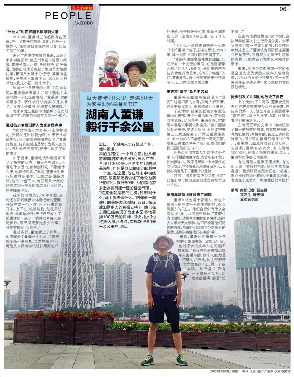 近日,一个湖南人步行路过广州。他叫董谦。真的是路过,一个月之前,他从老家湖南汨罗徒步出发,抵达广东,全程1100公里。他徒步的目的地是深圳,广州是他公益徒步的其中一个点。在这里,他在城市中轴线停留,跟