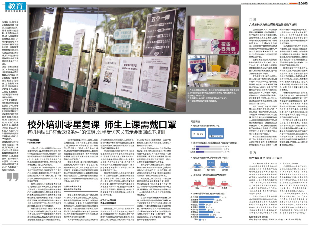 疫情期间,校外培训机构暂停线下授课,改为网课形式。随着疫情受到控制,全国各地中小学、幼儿园等学校陆续复课,早前,广州市教育局也发布2020年春季学期幼儿园、特殊教育学校和校外培训机构返园返校时间安排。