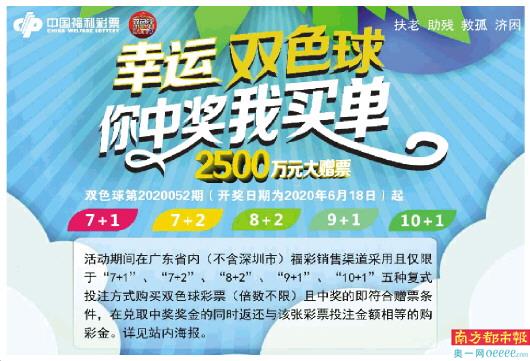 记者从广东省福彩中心获悉,为回报广大彩民对福彩事业的支持,该中心将自6月18日(双色球第2020052期)起在全省范围内(不含深圳市)开展中国福利彩票“幸运双色球,你中奖我买单”赠票活动。