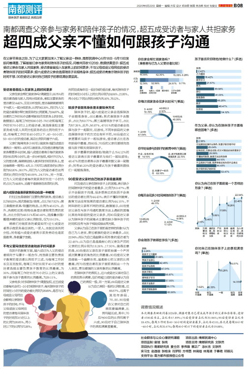 在父亲节来临之际,为了让大家更加深入了解父亲这一群体,南都民调中心6月18日-6月19日发起问卷调查,了解爸爸们参与家务和陪伴孩子的情况。问卷共回收1026份,数据结果显示:超五成受访父亲会与家人共担