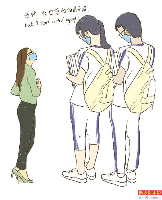 我和同学们亲亲热热、叽叽喳喳地讲话,就像一群小鸟飞进了教室,聊得都忘了交作业了。英语老师Amy进来了,见到我说的第一句话就是:“于浩然,我命令你不能再长高了!之前我们差不多高,现在我只能到你下巴了,显得我多没面子啊!”我也开玩笑说:“Amy,我也想和你肩并肩,but,I can’t control myself啊!”Amy老师被逗乐了,我也笑了起来。这时,我的好兄弟周子策跑过来了:“嘿,浩然,你可终于来了,我等你等得好辛苦啊!”说着,就想要一把抱住我。我赶紧把他推开:“疫情还没过去,我们还是保持安全的社交距离比较好,不要给病毒传播提供机会”。周子策用口罩遮住的脸艰难地扮了个鬼脸。