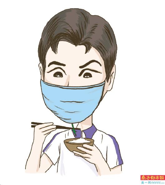 还记得刚开学第三天时发生的一件事:在餐厅吃饭时,我的同桌打完餐一坐下来,像平常一样准备开吃,只见他夹起一根满是油的菜往嘴里送,青菜没有如期送达嘴巴,被口罩挡住了。这时候他才反应过来,口罩上面已经沾满了油。只见他把口罩缓缓地摘下,脸上顿时涨得通红,不好意思地低下了头,潦草地吃着饭菜,神情又尴尬又无奈。我和旁边的其他同学对望了一下,忍不住哈哈大笑起来了。