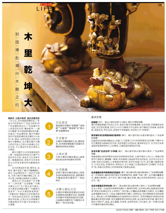 南都讯 记者许晓蕾 通讯员黄苏哲 7月15日,由中国国家博物馆、广东省文化和旅游厅(广东省文物局)和广东省博物馆主办,广东省潮州市人民政府协办的“雕绘乾坤——潮州木雕展”在中国国家博物馆开幕,共展出广